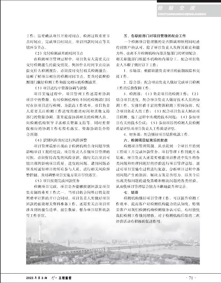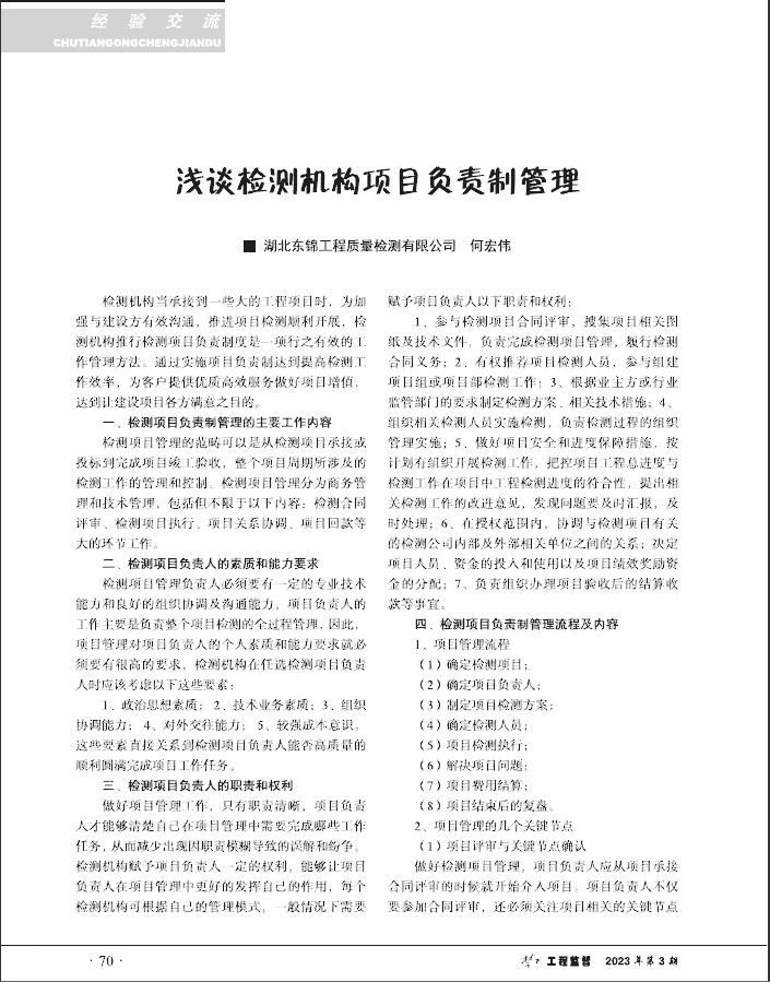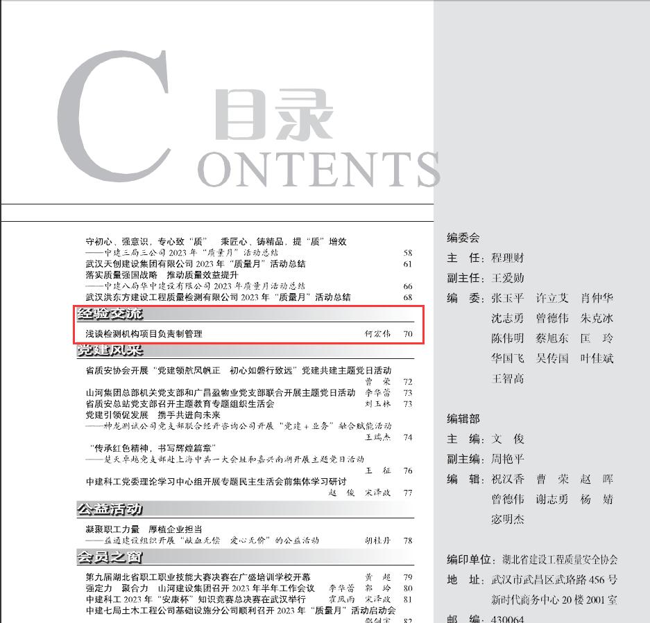 閱讀次數(shù):1148 發(fā)布時間:2023年10月25日2023年9月,公司何總撰寫的《淺談檢測機構(gòu)項目負責(zé)制管理》一文在《楚天工程監(jiān)督》質(zhì)量月專刊上發(fā)表。文中,何總從檢測項目負責(zé)制管理的主要內(nèi)容、檢測項目負責(zé)人的素質(zhì)和能力要求等六大方面闡述了檢測機構(gòu)項目負責(zé)制管理對檢測行業(yè)的促進作用。