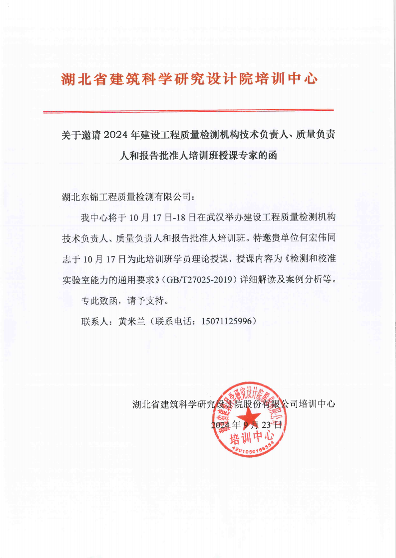 閱讀次數(shù):939 發(fā)布時(shí)間:2024年09月27日2024年9月23日,湖北省建筑科學(xué)研究設(shè)計(jì)院股份有限公司培訓(xùn)中心發(fā)函邀請公司總經(jīng)理何宏偉于10月17日-18日在武漢舉辦的建設(shè)工程質(zhì)量檢測機(jī)構(gòu)技術(shù)負(fù)責(zé)人、質(zhì)量負(fù)責(zé)人和報(bào)告批準(zhǔn)人培訓(xùn)班上授課。授課內(nèi)容為《檢測和校準(zhǔn)實(shí)驗(yàn)室能力的通用要求》詳細(xì)解讀及案例分析。
