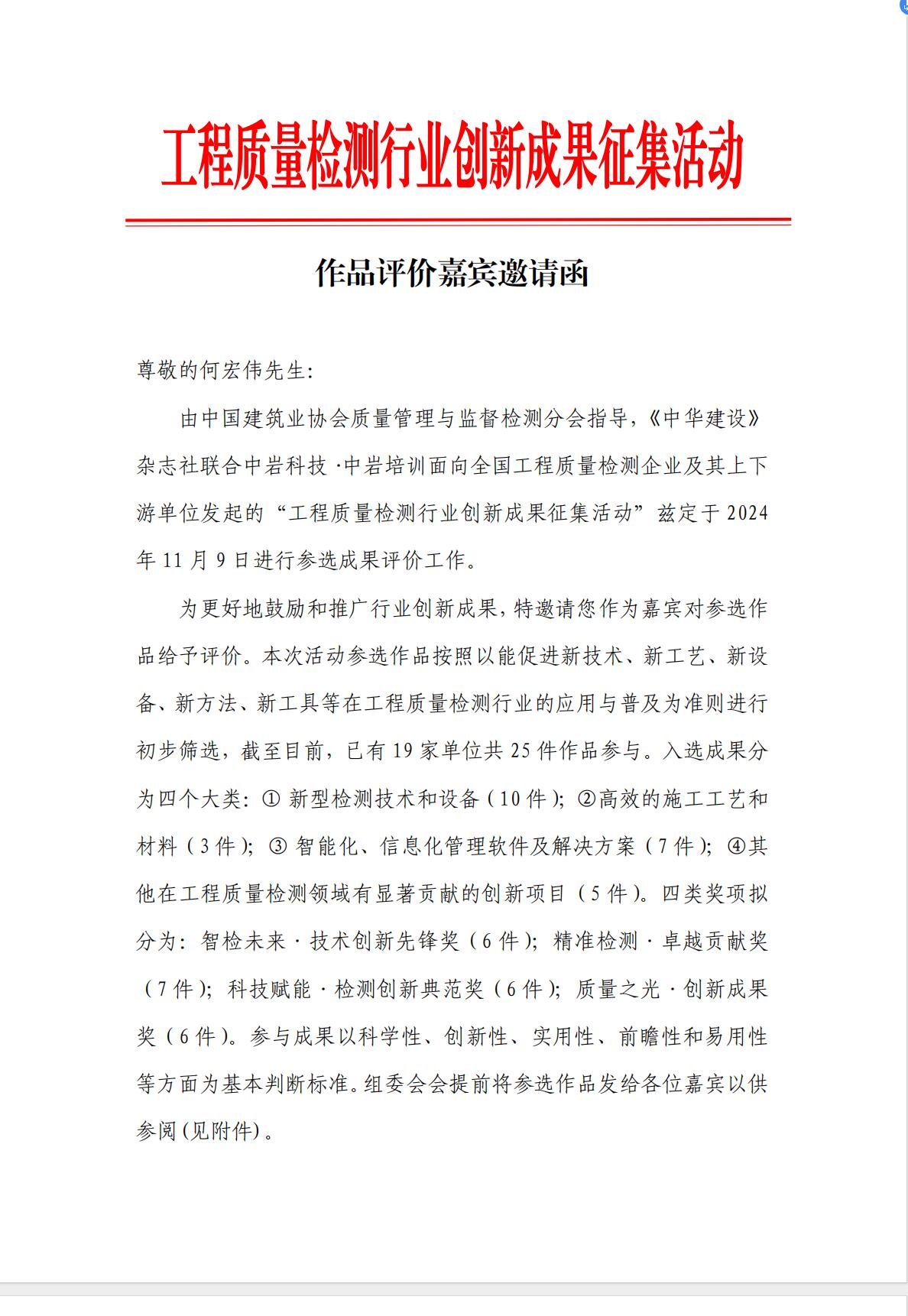 公司總經(jīng)理何宏偉受武漢中科巖土工程工程技術(shù)培訓(xùn)有限公司(中巖培訓(xùn))邀請,于11月9日對“工程質(zhì)量檢測行業(yè)創(chuàng)新成果征集活動”作為嘉賓對參選作品給予評價。