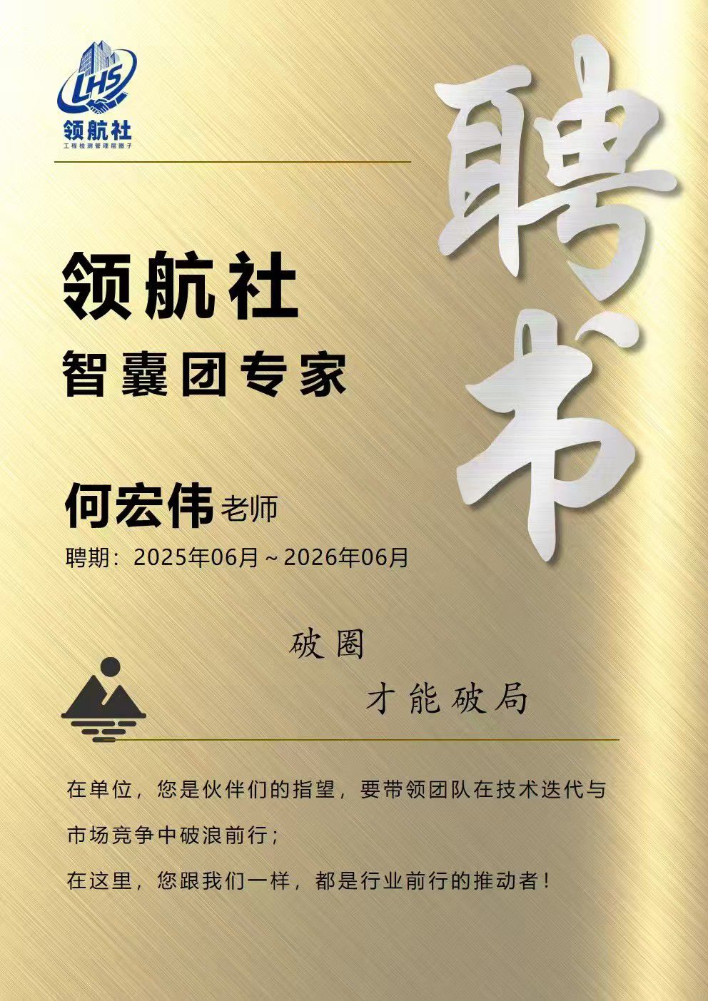 成立儀式上,中巖培訓為領航社首屆“智囊團”舉行了莊重的專家聘任儀式。公司總經理何宏偉先生因其在工程質量檢測領域四十余年的豐富實踐經驗、對行業(yè)痛點的深刻理解以及在企業(yè)管理與技術革新方面的杰出成就,獲得高度認可,被特聘為首批“智囊團專家”,聘期自即日起為期一年。