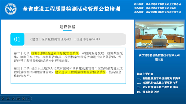 5月29日下午2:30,線上公益培訓(xùn)開始,武漢富思特創(chuàng)新信息技術(shù)有限公司總經(jīng)理謝玉超對新版湖北省建設(shè)工程質(zhì)量檢測監(jiān)管系統(tǒng)功能進行詳細介紹,新版湖北省建設(shè)工程質(zhì)量檢測監(jiān)管系統(tǒng)運用數(shù)字化手段和AI技術(shù),實現(xiàn)對檢測資質(zhì)和檢測活動的動態(tài)化、精準(zhǔn)化監(jiān)管,構(gòu)建了待辦中心、預(yù)警中心、決策中心三大核心功能模塊,實時監(jiān)測異常情況,并向監(jiān)管部門推送預(yù)警信息,助力各級監(jiān)管人員高效履職。系統(tǒng)還創(chuàng)新引入信用監(jiān)管機制,結(jié)合檢測機構(gòu)及從業(yè)人員的信用評價,實施差異化監(jiān)管,推動行業(yè)自律。 省質(zhì)安總站質(zhì)監(jiān)科工程師雷鳴對湖北省建設(shè)工程質(zhì)量檢測行業(yè)管理工作進行了回顧,介紹了以后一段時期要開展的主要工作及工作思路,比如:落實分類監(jiān)管、對墻體保溫材料整治與住建部住宅工程常見問題重點整治、修訂地標(biāo)《房屋市政工程質(zhì)量檢測項目分類規(guī)范》,通過提高市場行為、技術(shù)行為從而提高行業(yè)管理標(biāo)準(zhǔn)化水平、探索數(shù)智賦能和開展行業(yè)調(diào)研等工作,最后,對前期征集的大家關(guān)注的特別是新舊資質(zhì)過渡期間存在的相關(guān)問題進行答疑,并呼吁檢測機構(gòu)堅持初心,切實履行好為工程質(zhì)量保駕護航的使命。 這次培訓(xùn)對于全省監(jiān)督機構(gòu)、檢測機構(gòu)平穩(wěn)完成新舊資質(zhì)過渡、規(guī)范檢測行為、在新資質(zhì)標(biāo)準(zhǔn)下推動行業(yè)發(fā)展具有很強的指導(dǎo)作用。全省建設(shè)工程質(zhì)量監(jiān)督人員、檢測機構(gòu)相關(guān)人員計 7600人參加了本次培訓(xùn)。 此次培訓(xùn)由武漢富思特創(chuàng)新信息技術(shù)有限公司承辦。